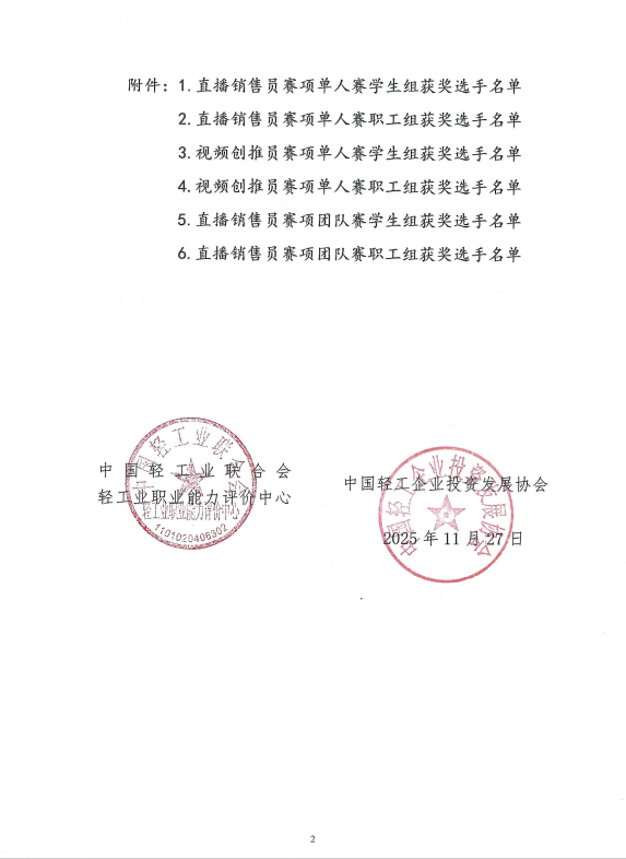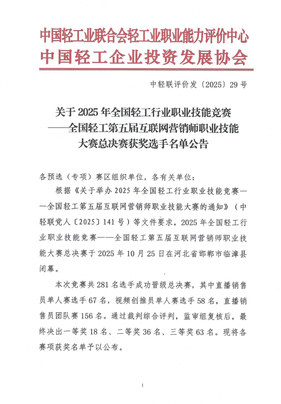 关于2025年全国轻工行业职业技能竞赛—全国轻工第五届互联网营销师职业技能大赛总决赛获奖选手名单公告